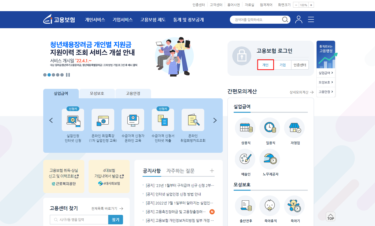 고용보험 사이트에 접속한 후 개인로그인을 해야 한다.