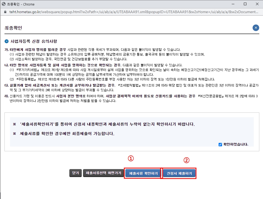 그리고 아래로 이동해 확인을 누르면 증빙서류 제출을 요구하는 팝업창이 뜨게됩니다.