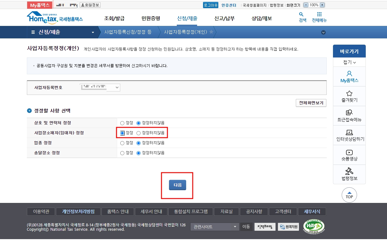 해당 사업자 번호를 클릭하셨다면, 정정할 사항 선택을 확인해 봅니다.