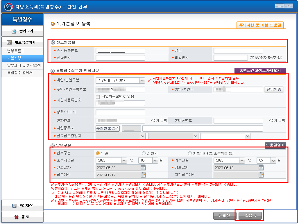 알아서 사업자 정보가 입력되는데요, 이후 빈칸인 신고인 정보 등을 채워넣고 자동으로 불러온 정보는 틀린부분이 없는지 다시 한 번 확인해 줍니다.