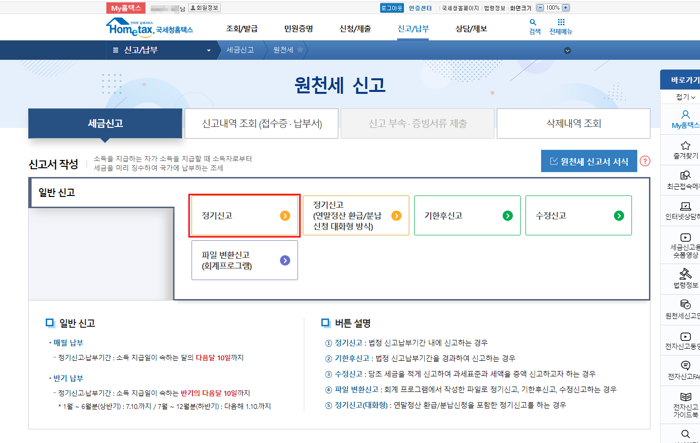 원천세 신고에 들어갔으면 위 화면처럼 "일반신고" 내에 있는 "정기신고"를 클릭해 줍니다.