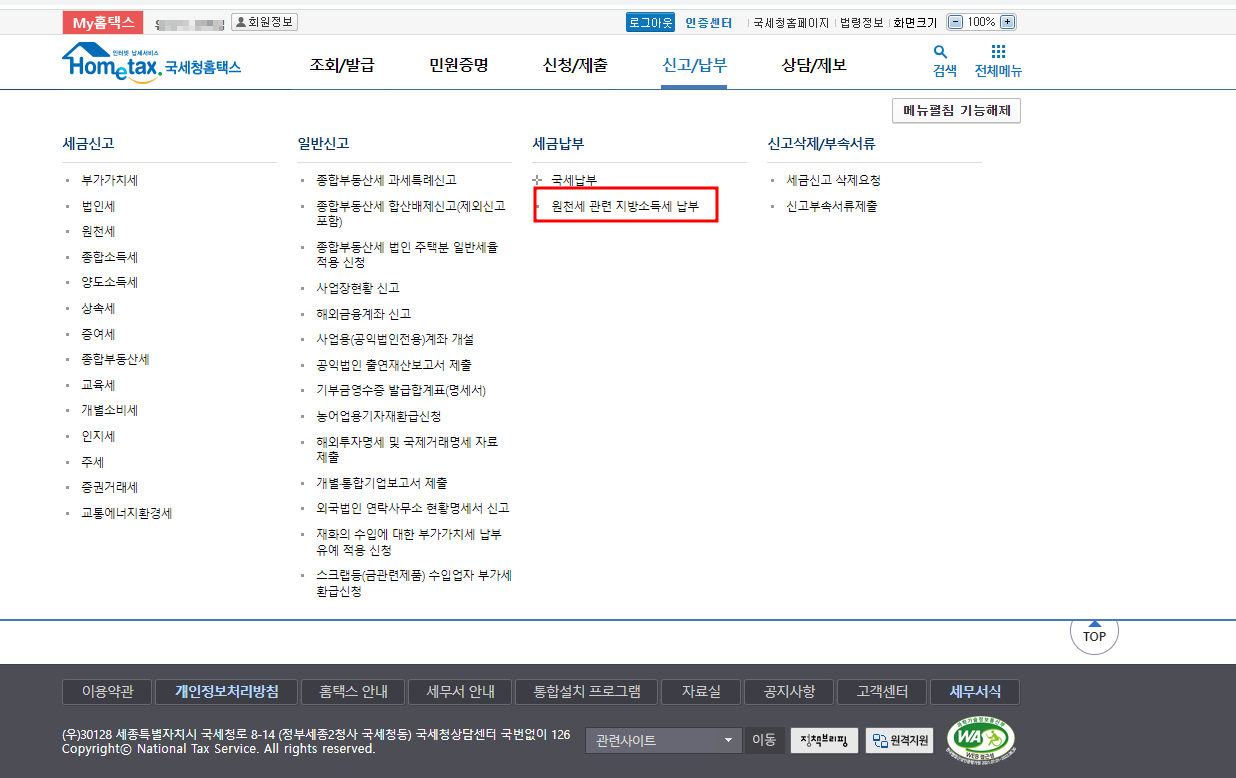 국세청 홈택스 내 세금납부 메뉴에서 "원천세 관련 지방소득세 납부"를 클릭해줍니다.
