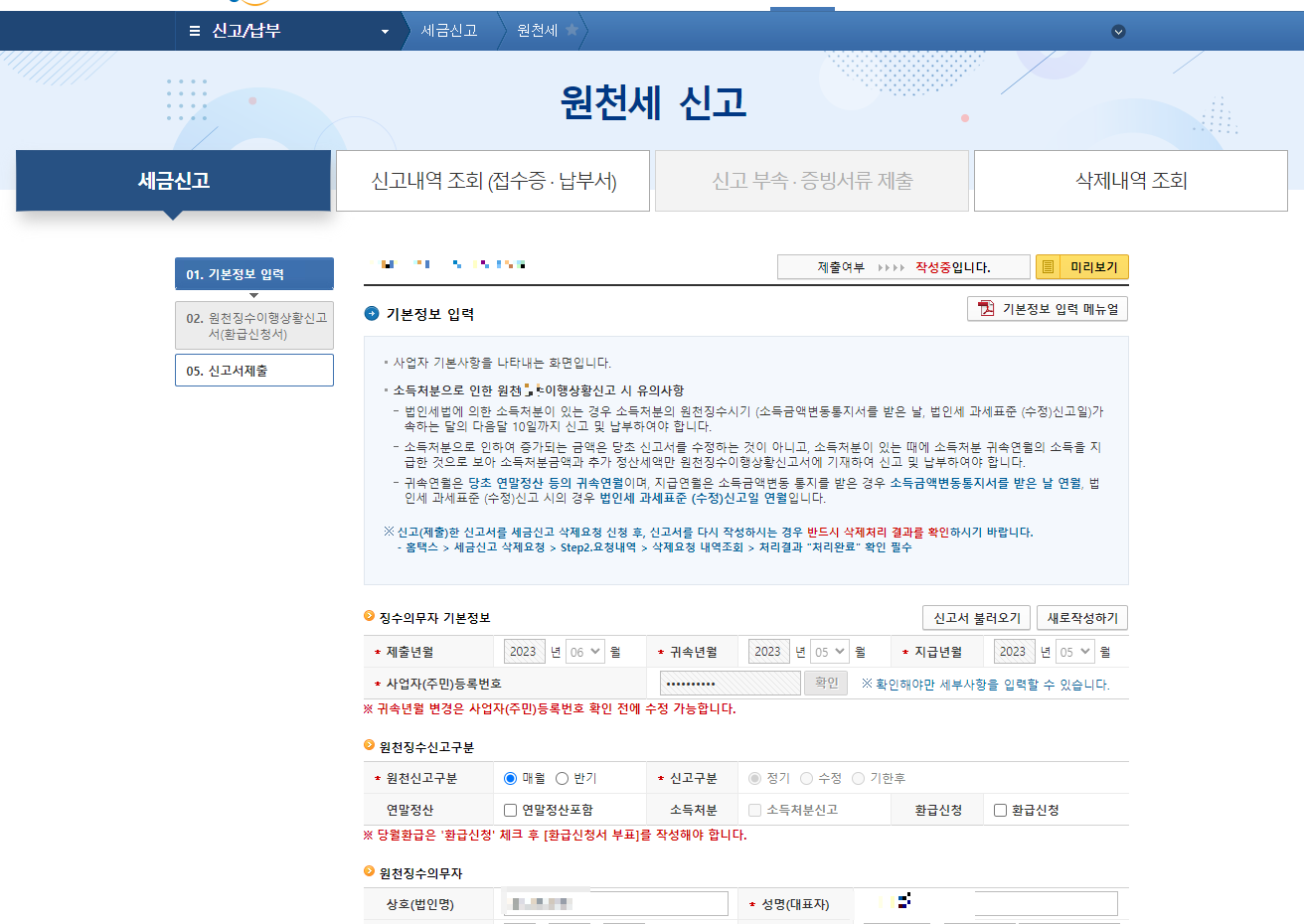원천세 기본정보를 입력할 수 있는 창이 뜨게됩니다. 자동으로 입력된 항목 외에 빈칸을 입력해 주면되는데요, 원천신고구분에 "매월" (반기로 하신다면 반기로 클릭하셔도됩니다.)을 클릭 후 아래 원천징수 의무자에 사업자 정보가 잘 입력되어있는지 체크해줍니다.