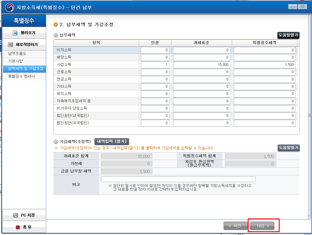 위에서 계산했던 15,000원에 대한 10%이기 때문에 해당 내역을 입력해 주도록 하고 "다음"을 클릭해 줍니다.